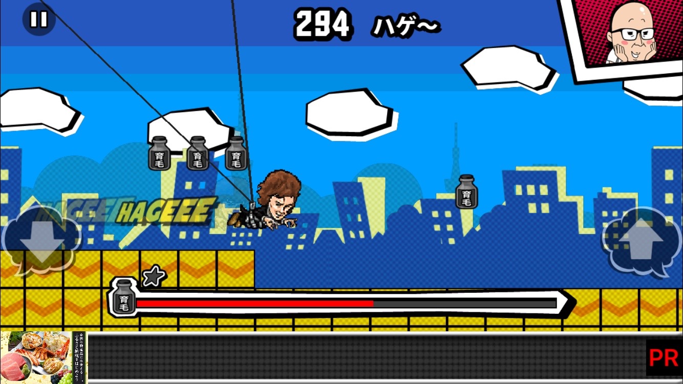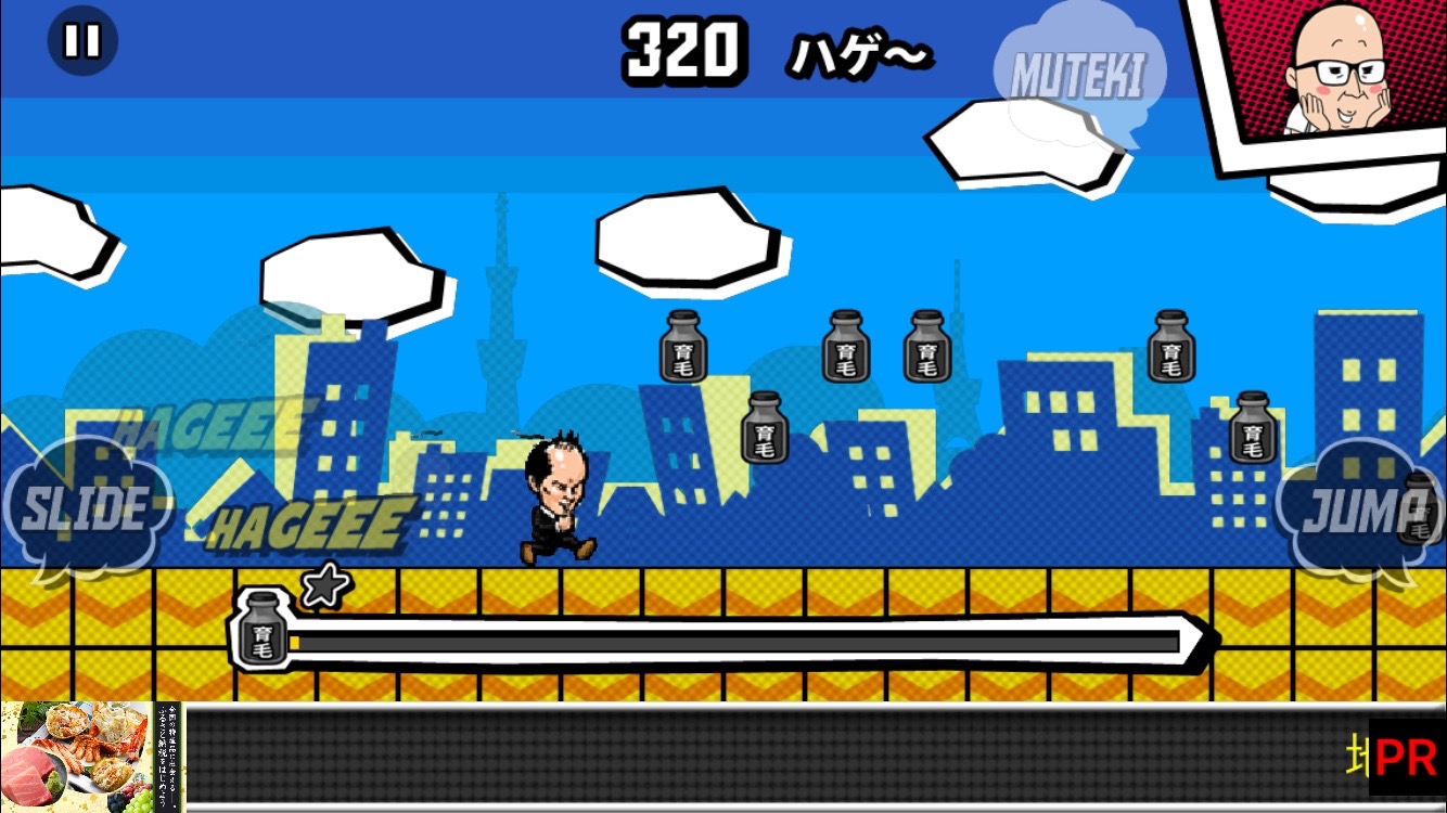 ゲーム内容は斎藤さんを操り、ステージを駆け抜けながら育毛剤をゲットするというもの。基本操作は操作はジャンプとスライディングですが、スマホの傾き利用して、斎藤さんの走る速度をコントロールすることも出来ちゃいます。よく見ると、走っている斎藤さんの毛が抜けちゃってますw
