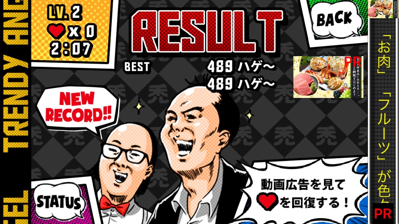 育毛剤を集めて画面下部のハゲージをMAXにすると無敵モードに。フサフサになった斎藤さんがワイヤーアクションで宙を飛びながら、障害物を壊して進んでいきます。そうそう、ゲーム中のBGMはトレンディエンジェルのネタでお馴染みのハゲラップです。