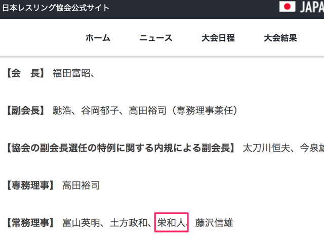 栄氏が責任をとって強化本部長を辞任したということで、一件落着・・・と思いきや、日本レスリング協会の公式サイトを見ると栄氏は強化本部長以外にも・会長指名理事