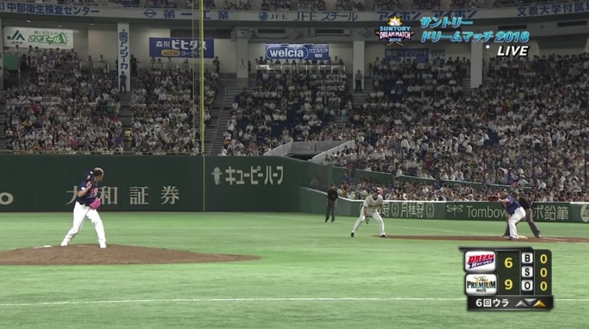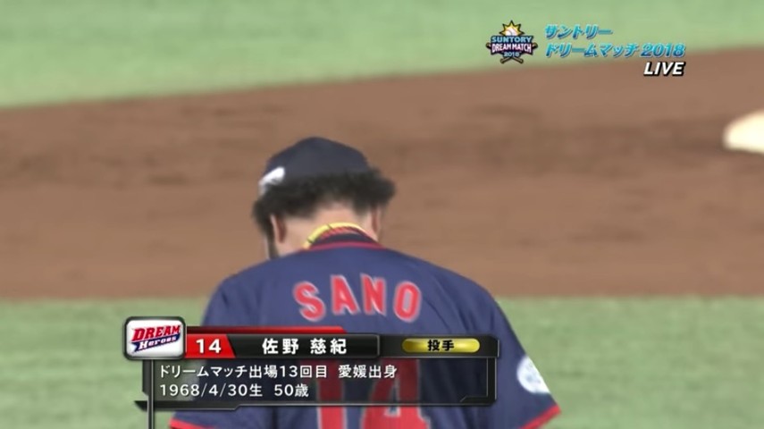 6回のマウンドに上ったのは近鉄の中継ぎとして活躍した佐野慈紀投手。その登場に球場はどよめきます。