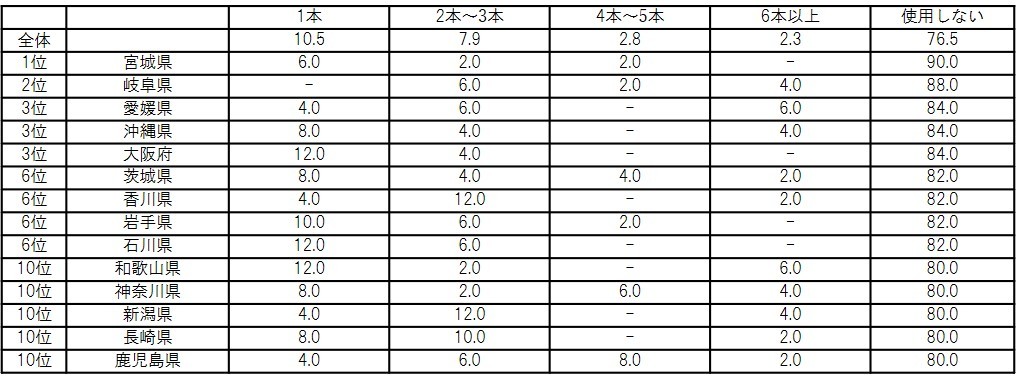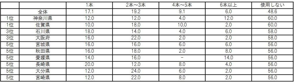 そんなシャンプー使用本数の高い神奈川県ですが、コンディショナーの年間使用本数になると、60%が「使用しない」という意外な結果も出ています。