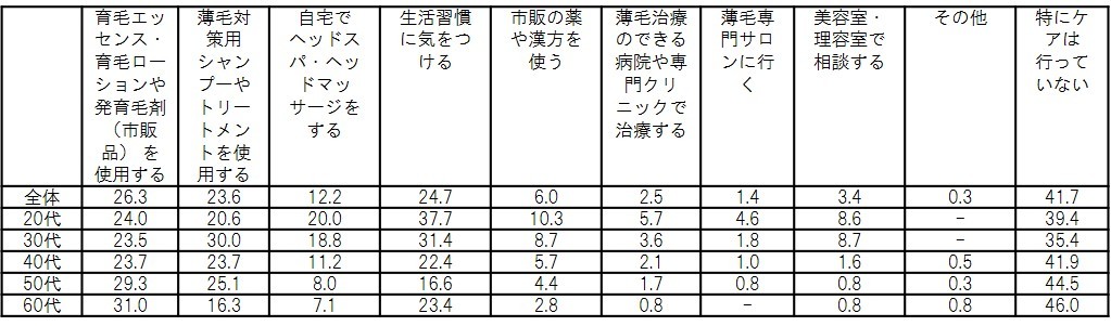 「薄毛ケア(薄毛の予防や対策)として、どのようなことを行っていますか?」という問いでは、最も回答が多かったのが「育毛エッセンス・育毛ローションや発育毛剤(市販品) を使用する(26%)」でした。「モテたい」「仕事上、清潔感が求められる」という理由でヘアケアをする男性が多かった20〜30代では「生活習慣に気をつける」という回答が最も多くありました。