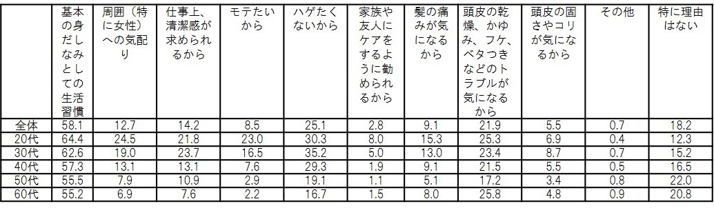 ヘアケアをする理由については「ハゲたくない(25%)」という回答よりも、「基本の身だしなみとしての生活習慣(58%)」という回答が多いという結果も分かっています。