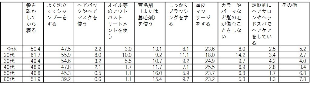 あなたが普段からしているヘアケアを教えてください」という問いでは、最も多かったのが「髪を乾かしてから寝る」という回答で50%。2位の「頭皮マッサージ(24%)を大きく引き離して断トツの1位となりました。というか、髪の毛乾かさずに寝る人っているんですか!?