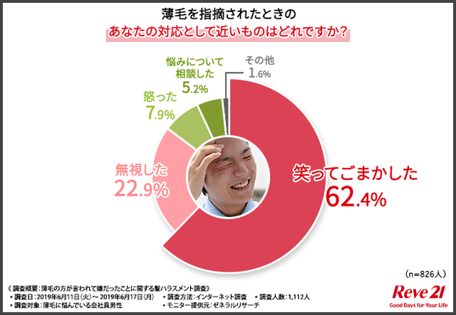 続いて、「薄毛を指摘されたときのあなたの対応として近いものはどれですか?」という質問には、「笑ってごまかした(62.4%)」と回答した人の割合が最も多く、次いで「無視した(22.9%)」「怒った(7.9%)」と続きました。