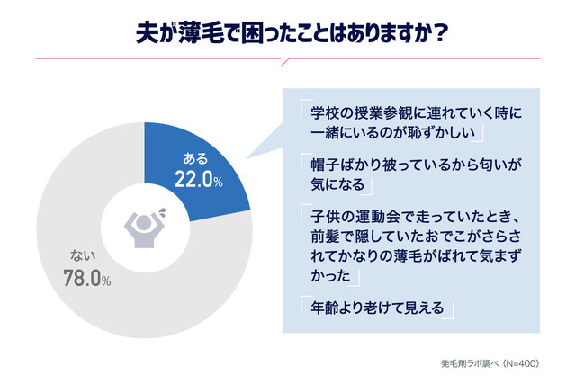 「夫が薄毛のために困ったことはありますか?」との問いに対しては、「困ったことがある」(22%)。