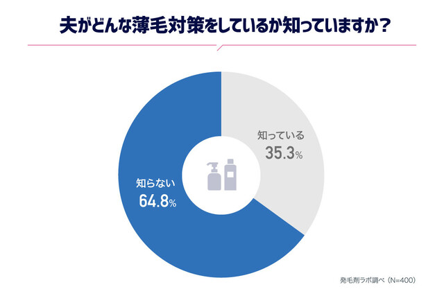 「夫がどんな薄毛対策をしているか知っていますか?」の問いには、「知らない」(64.8%)で、妻は夫の薄毛対策を知らないことが明らかになりました。