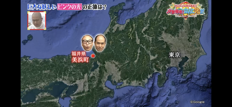 東京駅をスタートした2人が訪れたのは福井県美浜町。なんとここに夜な夜なピンク色に光る場所があるのだとか…。