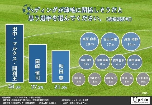 ちなみに、歴代日本代表のメンバーから、ヘディングが薄毛に影響してしまっているかもしれないと思う選手を選んでもらった結果がこちらです。