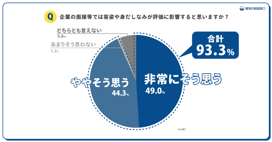 加えて「企業の面接等では容姿や身だしなみ評価に影響すると思いますか?」の問いでは、実に93.3%の人が影響すると回答。