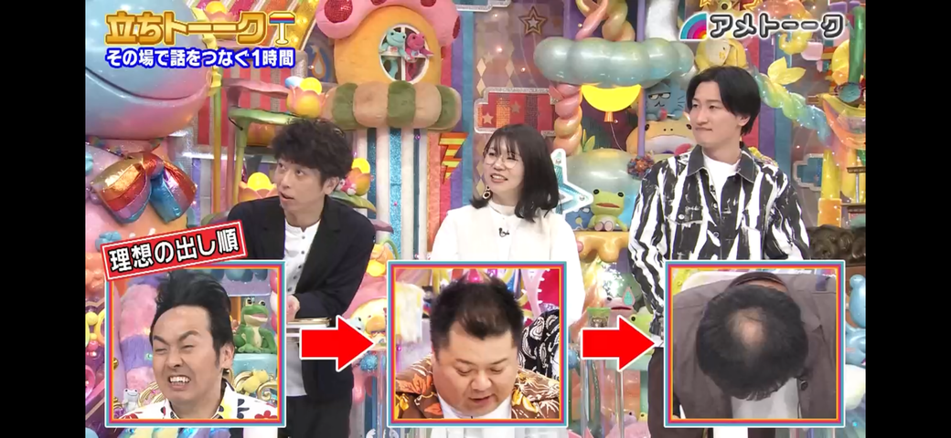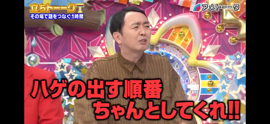 出演芸人が立ち話で珠玉のトークを展開していく企画ですが、その中でアンガールズ田中がスタジオにハゲ芸人が複数いる場合、ハゲを披露する順番を考えて欲しいと話し始めました。