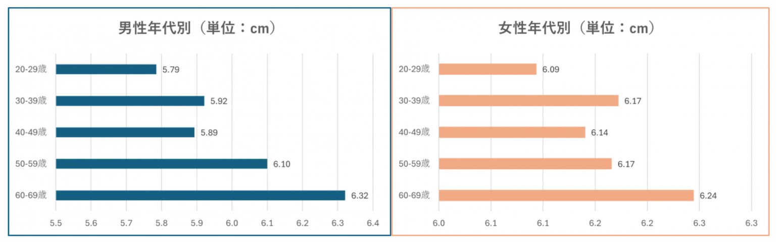 また、男女別で見ると、同じ20代でも薄毛の境界線で男性5.79cm、女性6.09cmと女性の方がハゲに寛容であることも分かりました。
